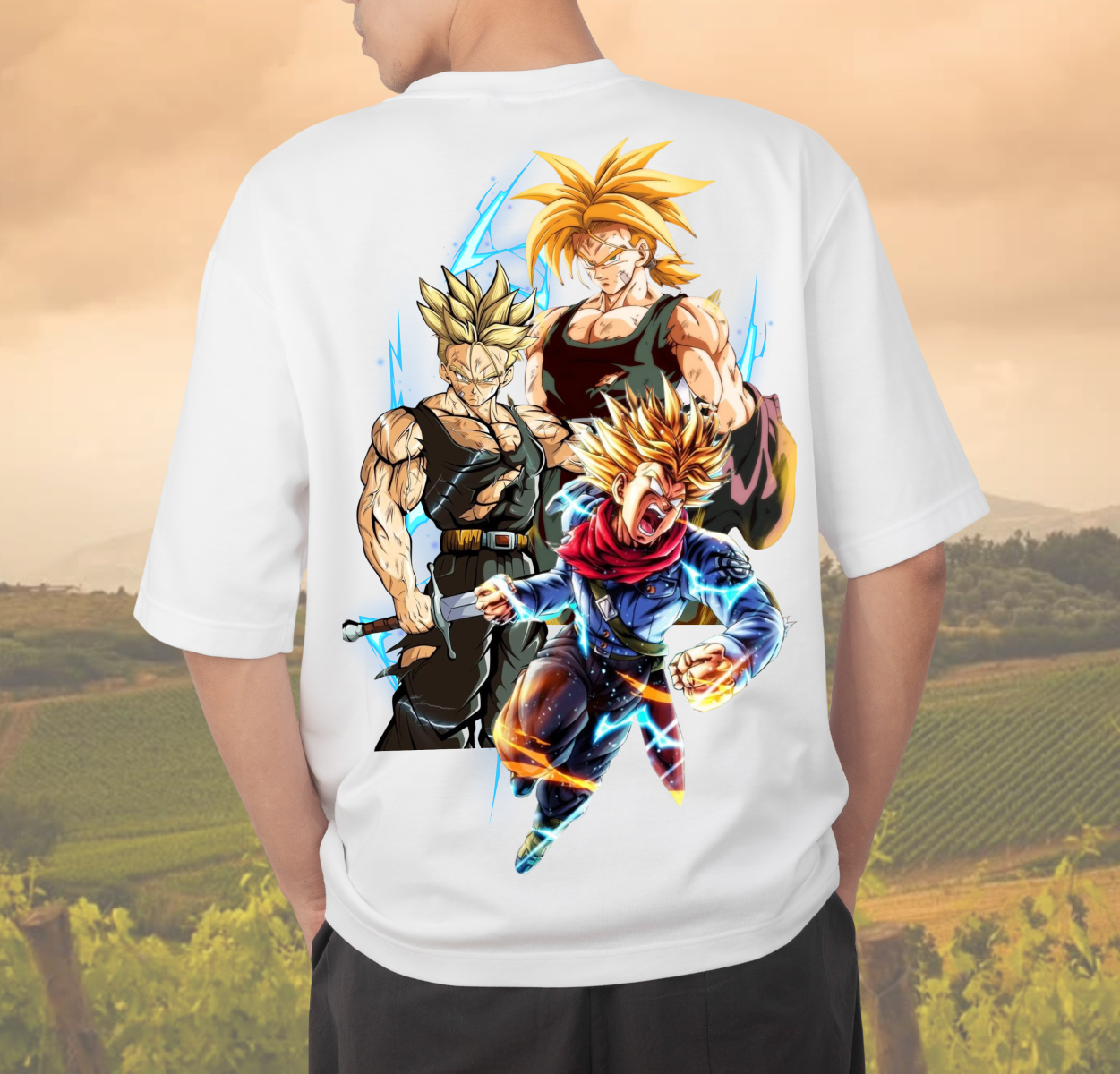 Available in classic Black and White, this unisex oversized T-shirt is the perfect statement piece for fans who admire Trunks’ fearless warrior spirit.